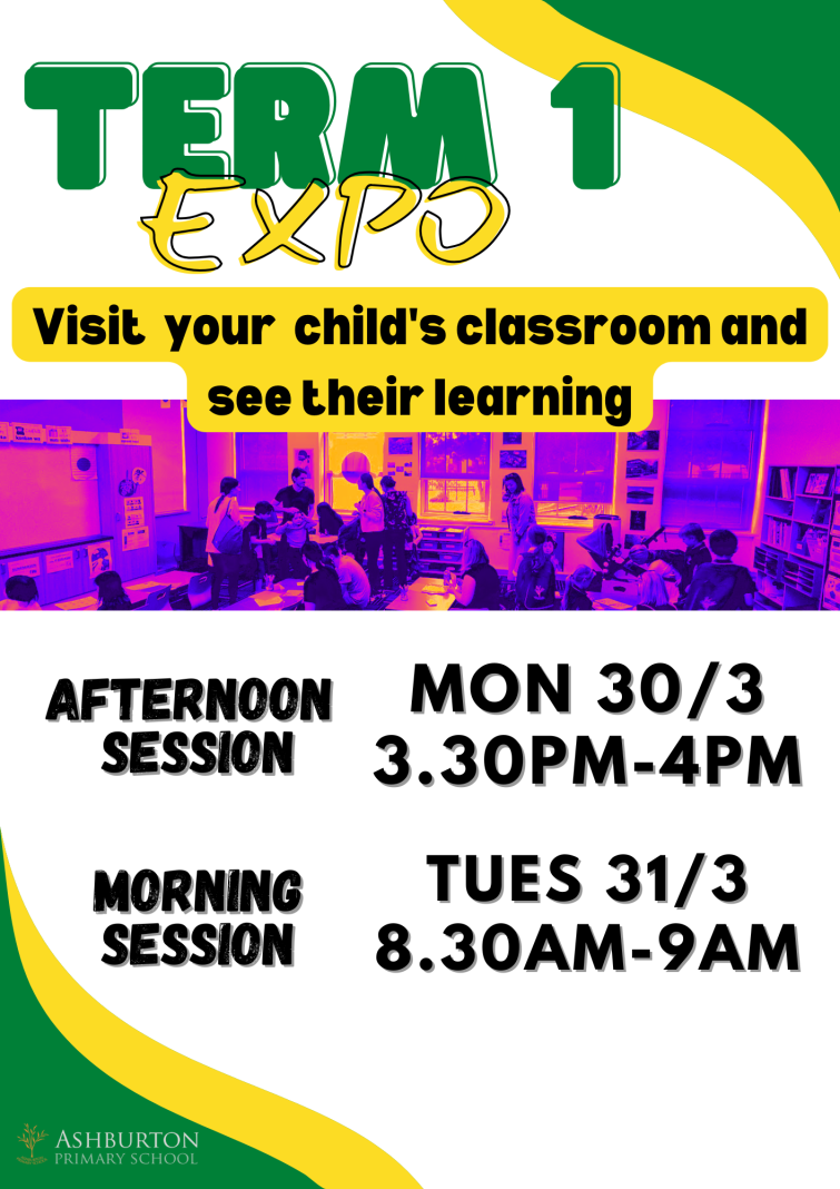 A reminder that we will be running our Term 1 Whole School Expo during two times to cater for as many families as possible. The first will be after school on Monday, March 30th and run from 3.30pm to 4pm. The second will be the following morning, Tuesday March 31st between 8.30am and 9am. The Expo is a great opportunity for students to share their term's learning by inviting parents into the classrooms. Specialist classrooms will also be open for visits too!