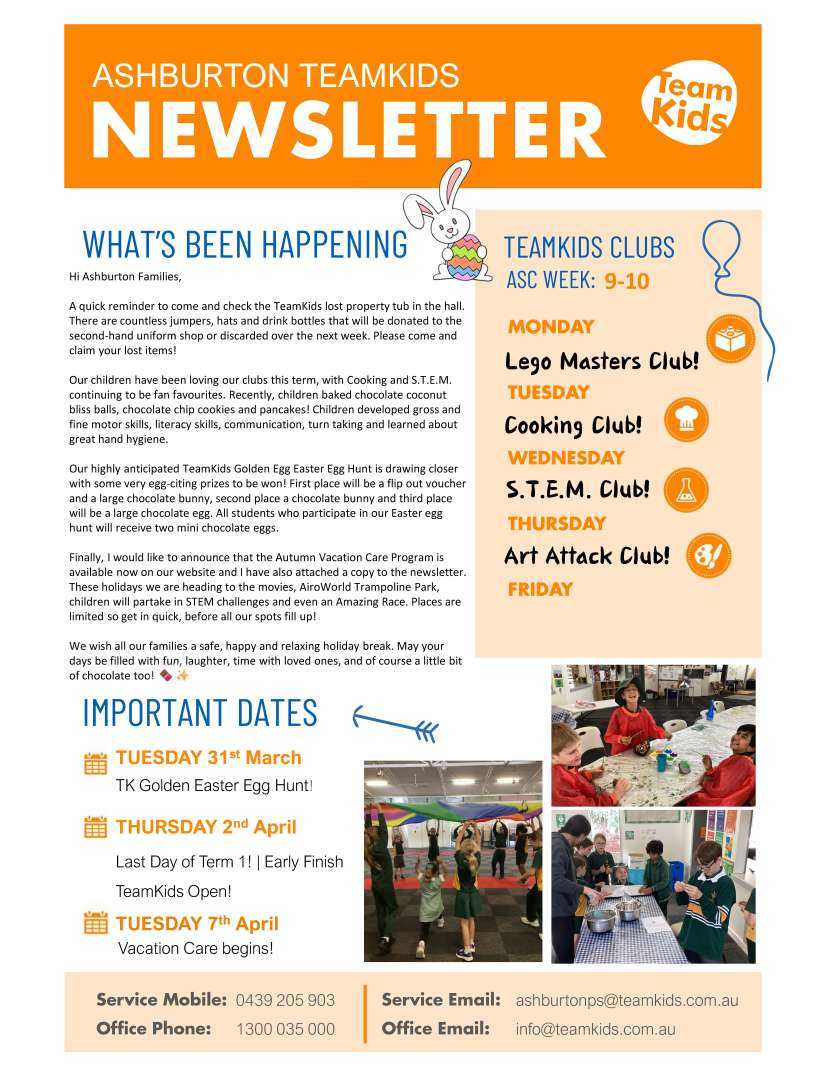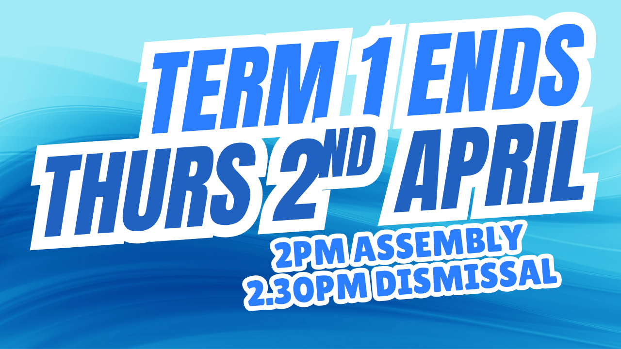 The final day of Term 1 is next Thursday, April 3rd. We will be concluding the term with an Assembly at 2pm in the hall before dismissal at 2.30pm. Term 2 starts on Monday, April 20th.