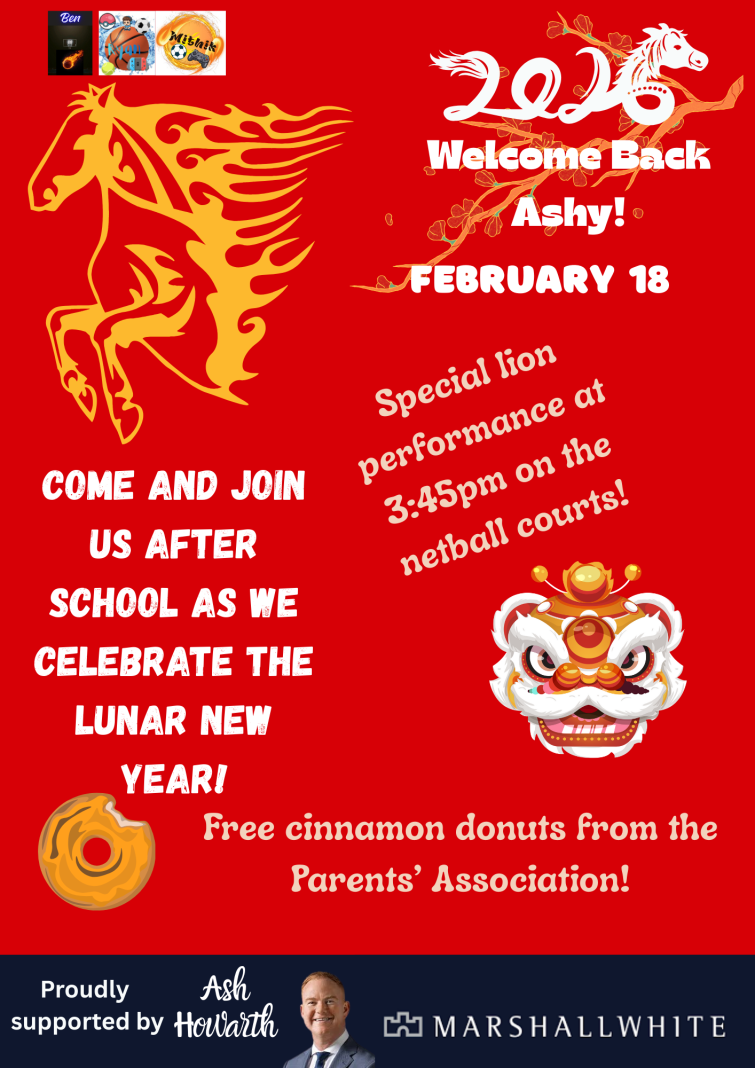 Don't forget to drop into our Welcome Back Ashy event next Wednesday, February 18th for the Lion Dance to celebrate the upcoming Lunar New Year and the second hand uniform sale. Students can also collect their free donut too! We thank Ash Howarth from Marshall White for supporting PA in the event.